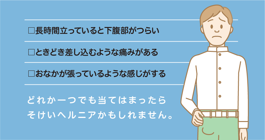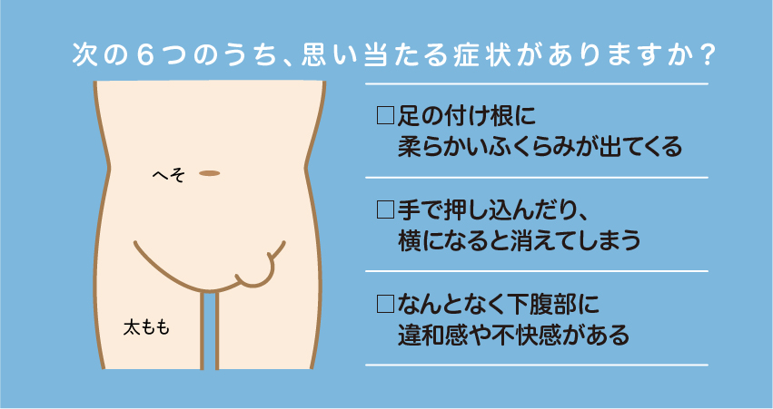 “足の付け根に柔らかいふくらみが出てくる”、“そのふくらみは手で押し込んだり、横になると消えてしまう”、”なんとなく下腹部に違和感や不快感がある”などのお悩み・症状はありませんか?